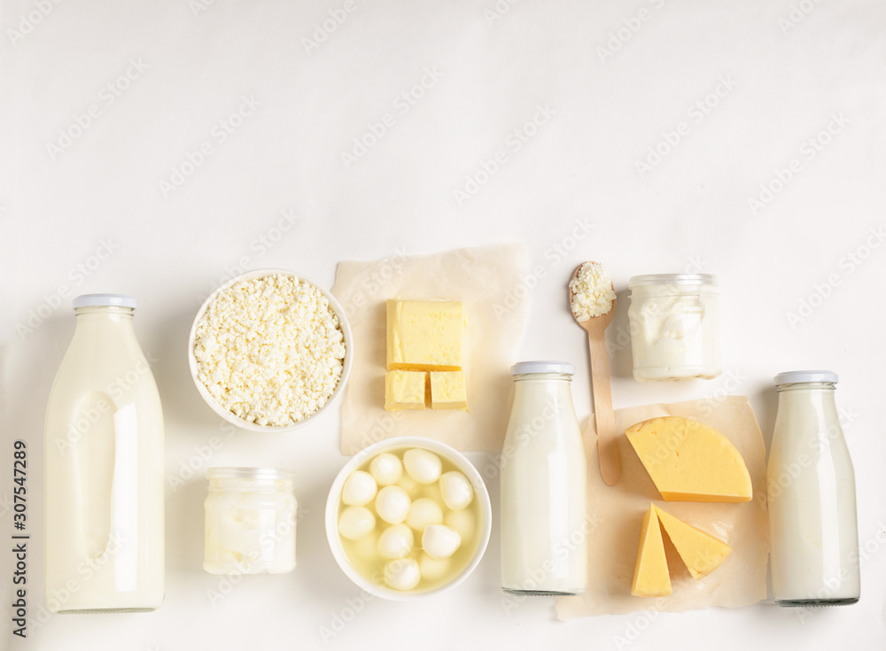 Dairy and fermented milk fermented organic products on a white background. Milk kefir yogurt butter cheese assortment. #307547289