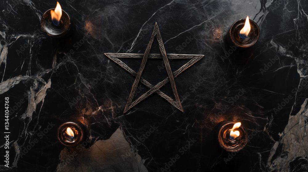 Dark altar with satanic obsidian pentagram and occult candles #1344104768