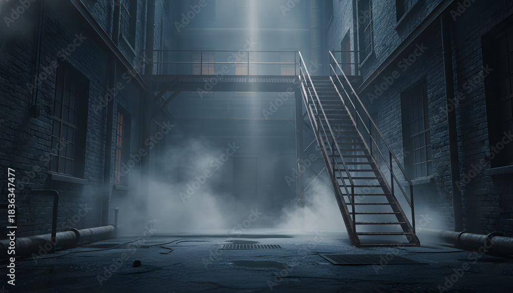 Dark and foggy urban alley with fire escape stairs and dramatic light #1836347477