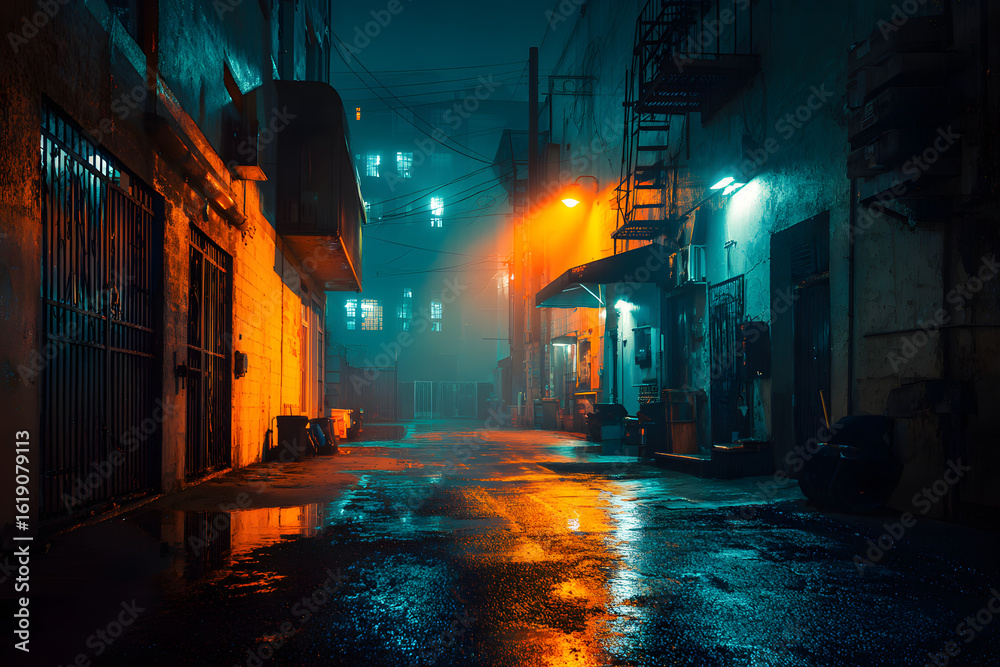 Dark downtown back alley at night after raining. Urban back street with atmospheric lighting and soggy street. Inner city dark alleyway. Urban decay and weathered architecture. Generative AI #1619079113