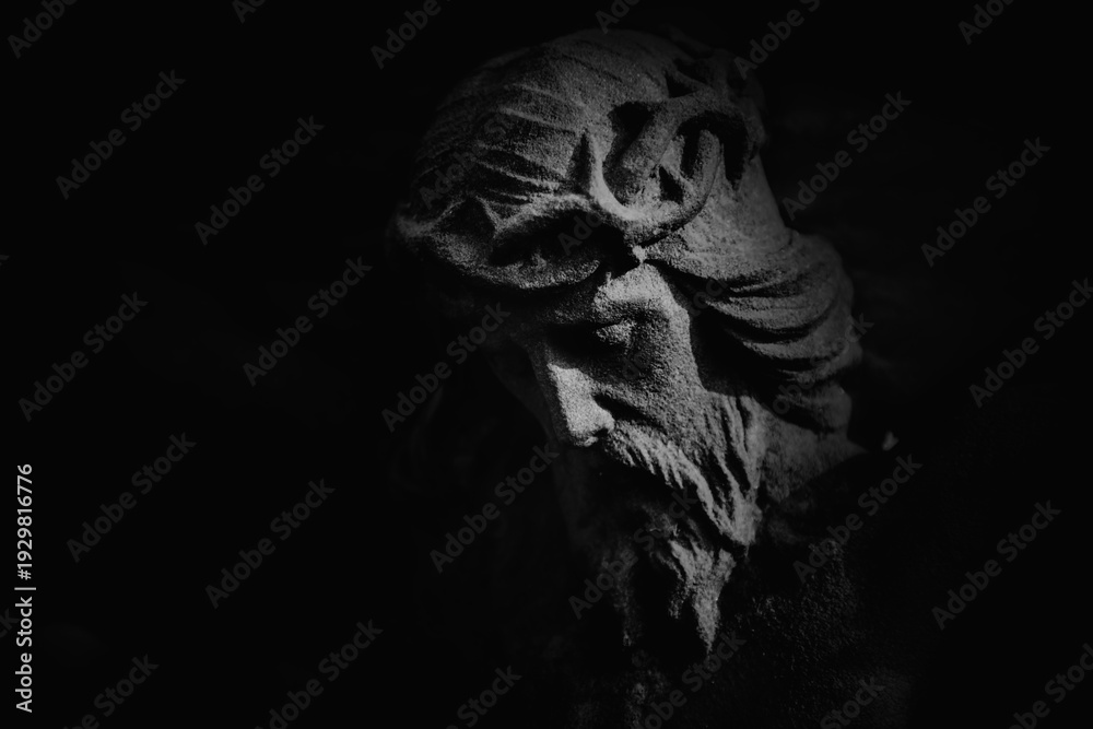 Dark dramatic close-up of Jesus Christ stone statue in deep shadow, symbol of suffering, sacrifice, faith, and spiritual endurance. Copy space for text or design. #1929816776