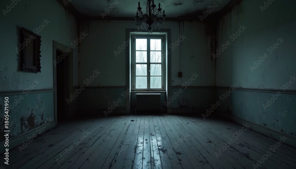 Dark empty old room with large window, chandelier. Peeling walls, wooden floor show decay. Spooky interior of abandoned house creates creepy mystery mood, perfect for horror movie or game background. #1805471950