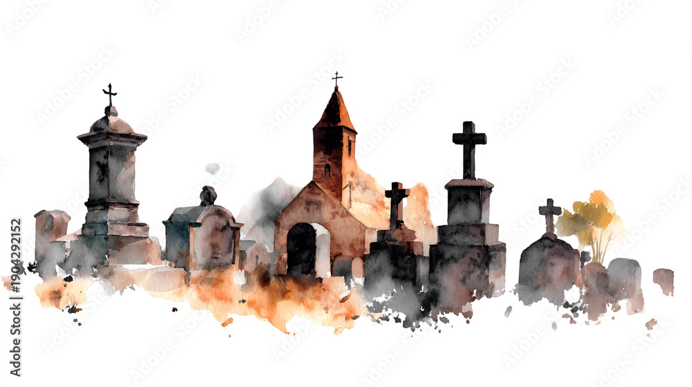 Dark Gothic Watercolor Ancient Graveyard with Church and Crosses #1904292152