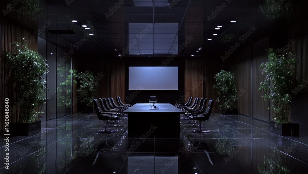Dark, modern boardroom with empty chairs and large screen. #1160048040