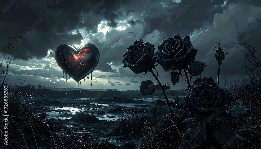 Dark, ominous landscape with a broken heart and black roses #1726835783