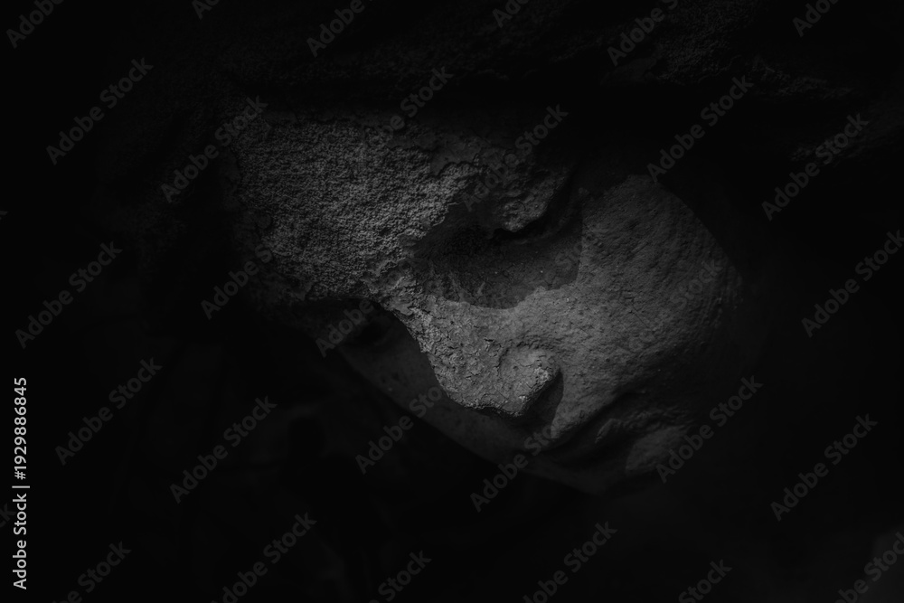 Dark stone statue face emerging from shadows, symbol of sorrow, silence, grief, and spiritual contemplation. #1929886845