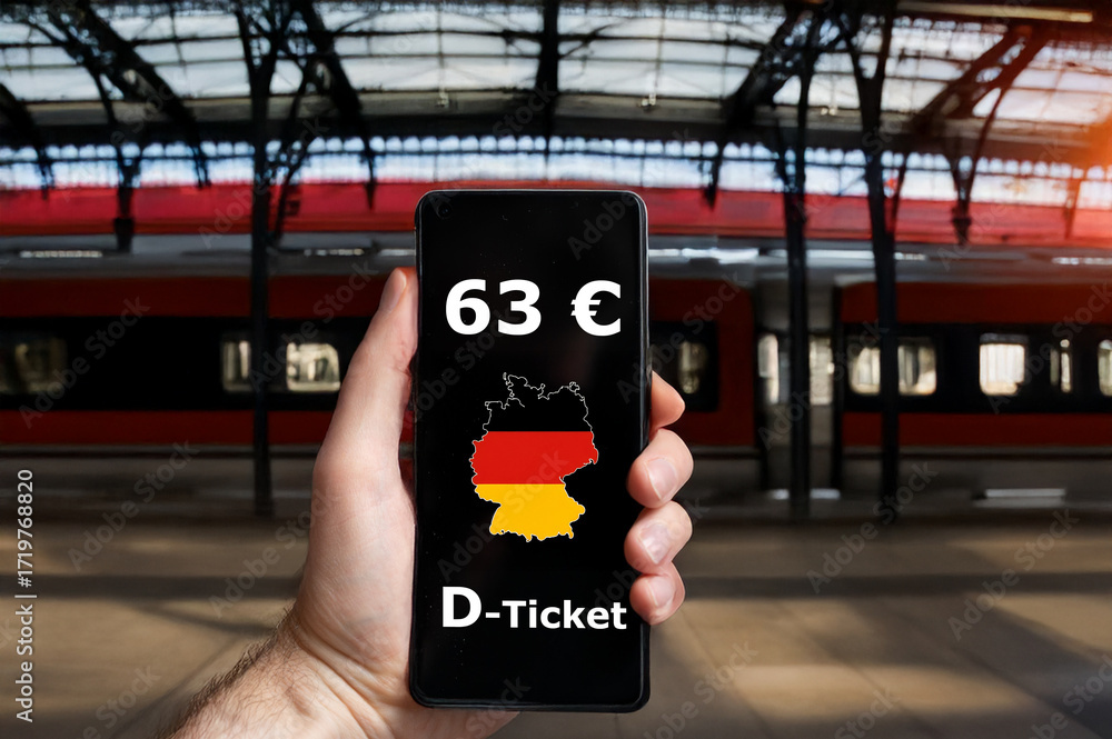Das Deutschlandticket (D-Ticket) kostet ab 2026 nun 63 Euro statt 58 Euro. Digitale Fahrkarte auf dem Smartphone für den bundesweiten ÖPNV und Regionalverkehr. Symbolbild zur Preiserhöhung im ÖPNV #1719768820