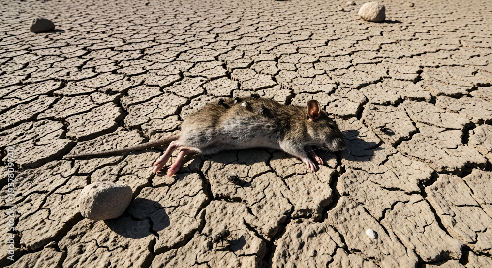 Dead rat lying on dry cracked earth during extreme drought #1937809740