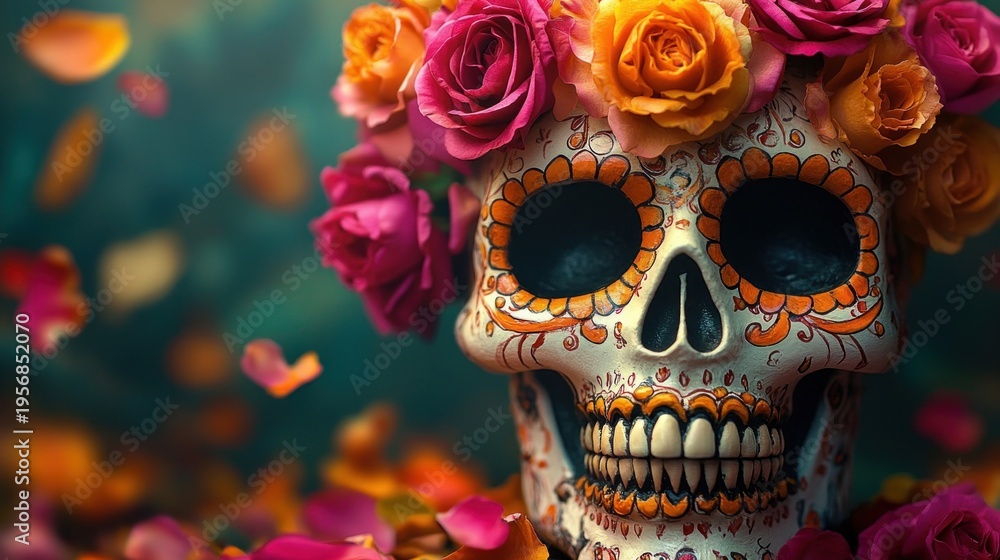decorated skull with colorful rose and marigold crown, falling petals and ornate painted patterns, evoking festive remembrance and gentle melancholy #1956852070