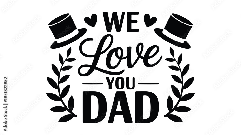 Decorative Father’s Day typography design featuring the phrase “We Love You Dad” with bold stylized fonts, top hats, hearts, and laurel branches, symbolizing love, respect, and appreciation for fathe #1951322952