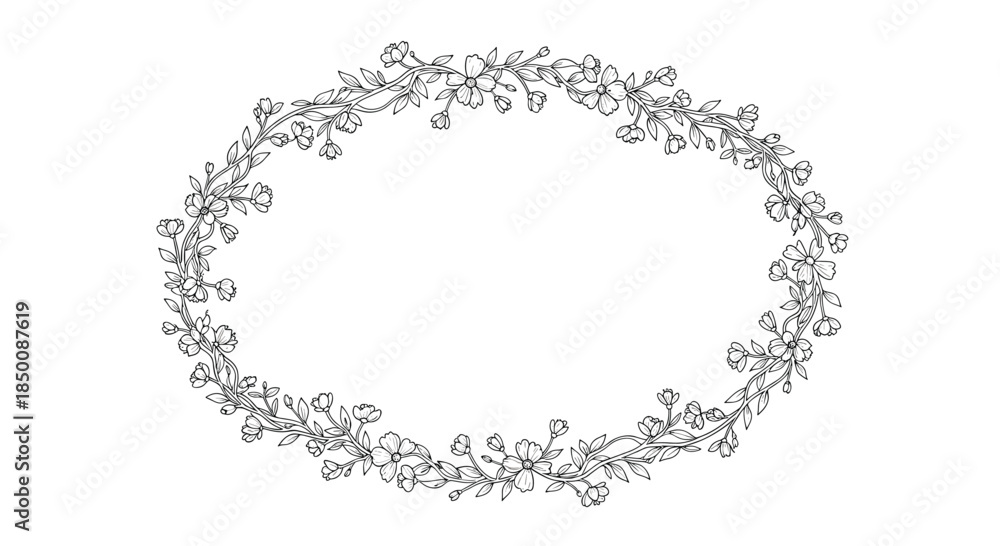 Decorative oval frame composed of delicate black and white hand-drawn floral branches and small blossoms on a clean white background. #1850087619