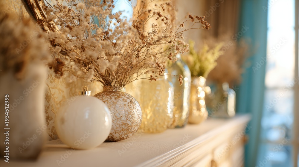 Decorative vases with dried flowers on a mantel in a bright room #1934512995