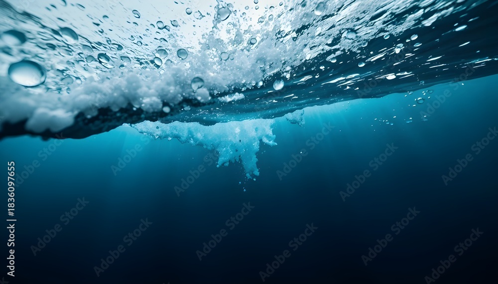Deep blue stormy sea viewed underwater with abstract blurred waves, creating dramatic and immersive aquatic scene #1836097655