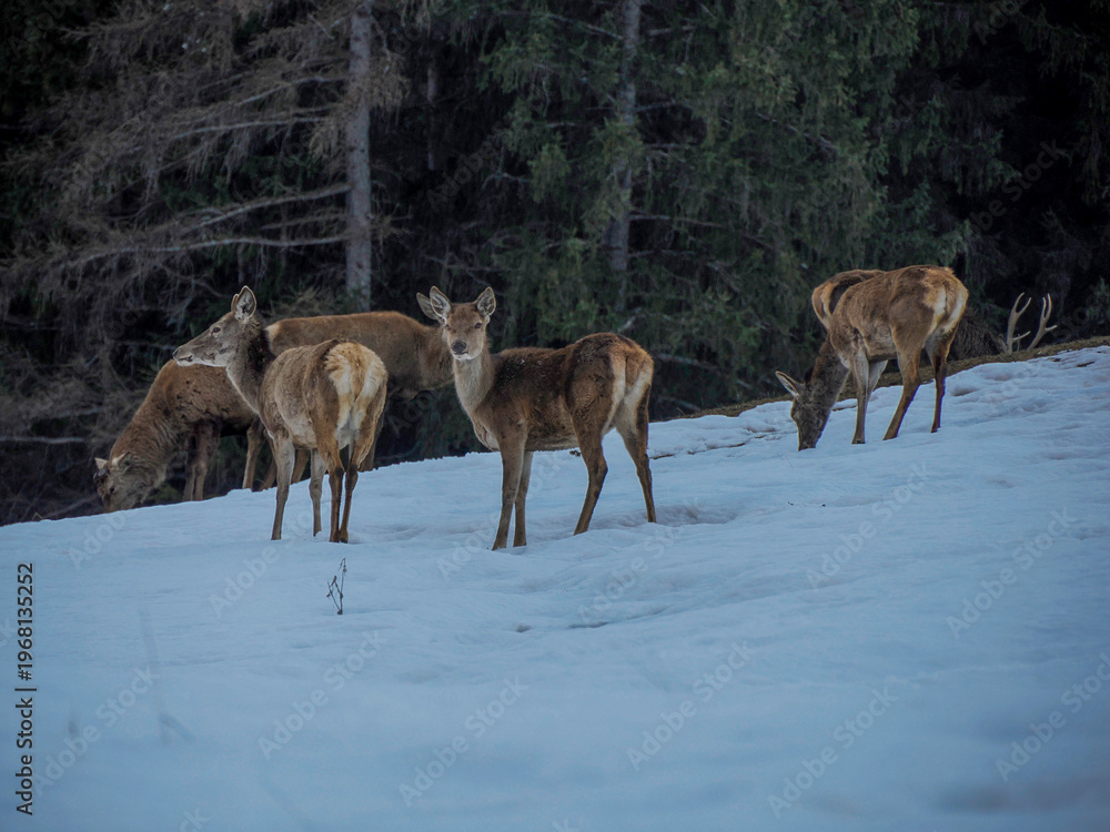 deer looking for food on snowy dolomites mountains #1968135252