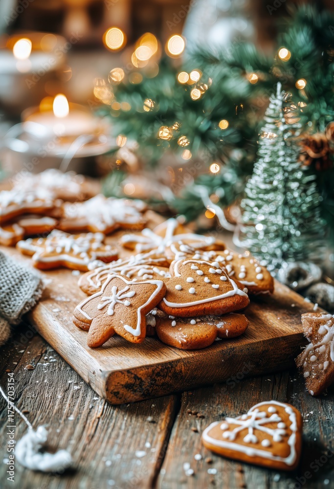 Delicious Gingerbread Cookies With Snowflake Designs on a Wooden Platter During the Holiday Season #1757703154