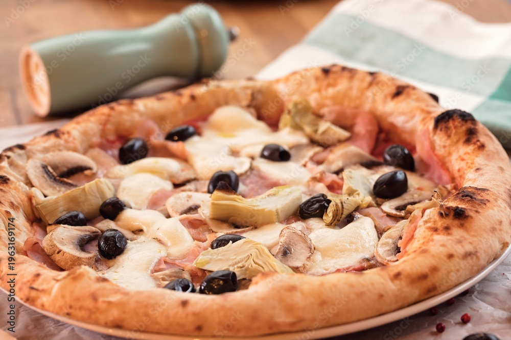 Delicious homemade pizza sits invitingly on a plate, adorned with fresh mushrooms, artichokes, and olives. This meal represents warmth and love, perfect for tough financial times #1963169174