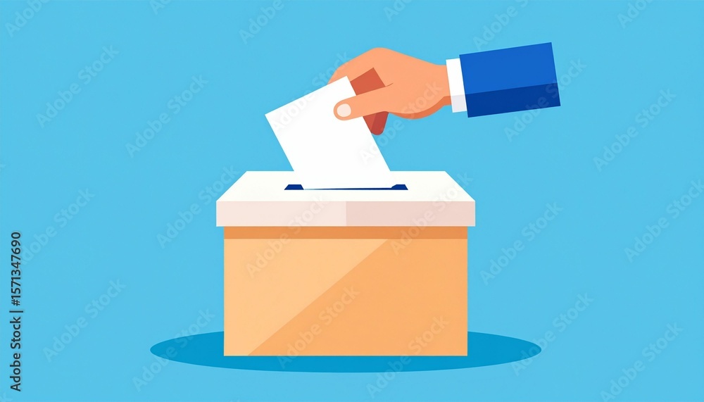 Democratic voting concept, featuring a stylized hand placing a paper ballot into a slot of a ballot box, set against a clean, minimalistic background. #1571347690