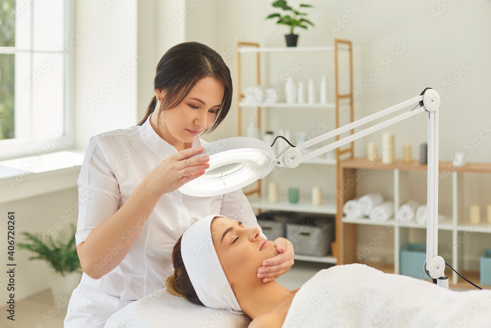Dermatologist directing lamp to womans face during checking skin #406720261