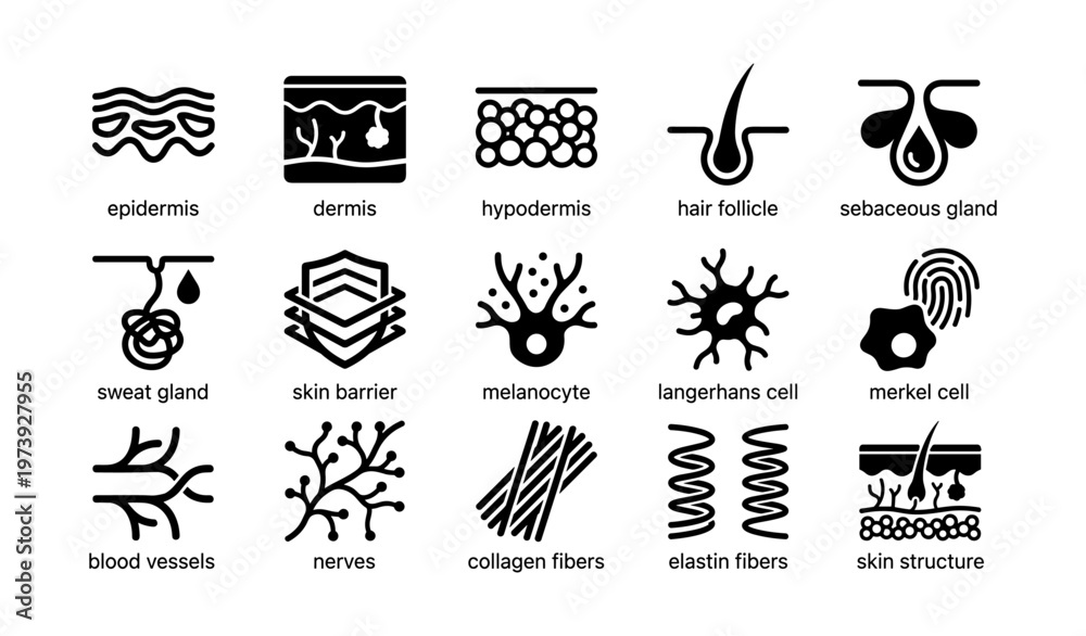 Dermatology icons: epidermis, dermis, hypodermis, hair follicle, sebaceous gland #1973927955