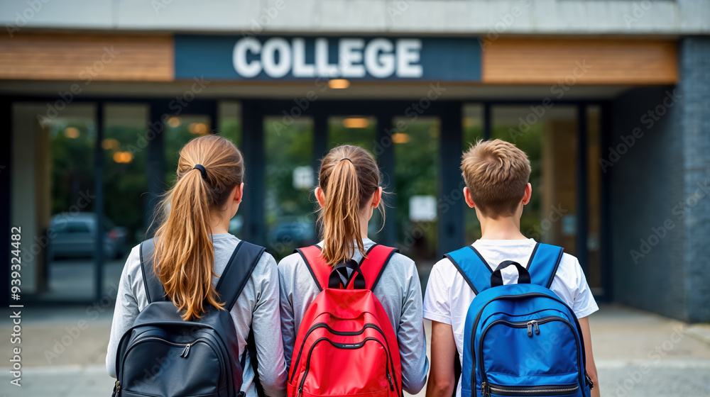 des collégiens le jour de la rentrée scolaire devant un collège - vus de dos #939324482