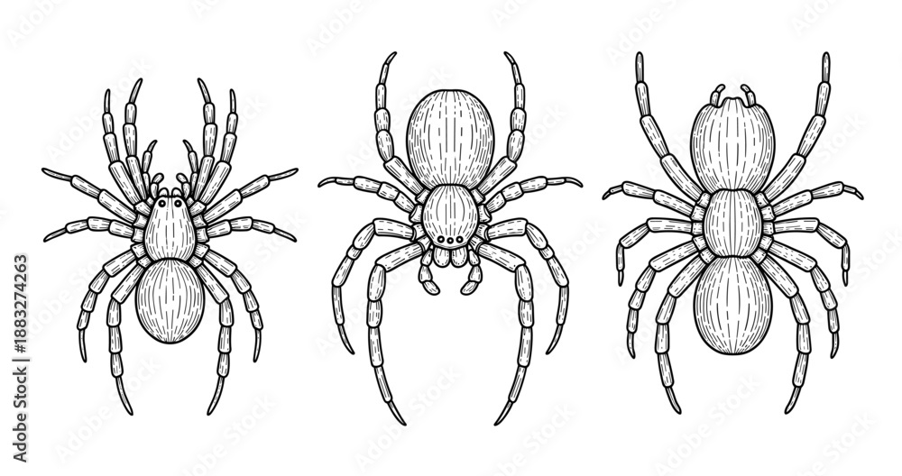 Detailed black and white ink drawings of three spiders with distinctive patterns #1883274263