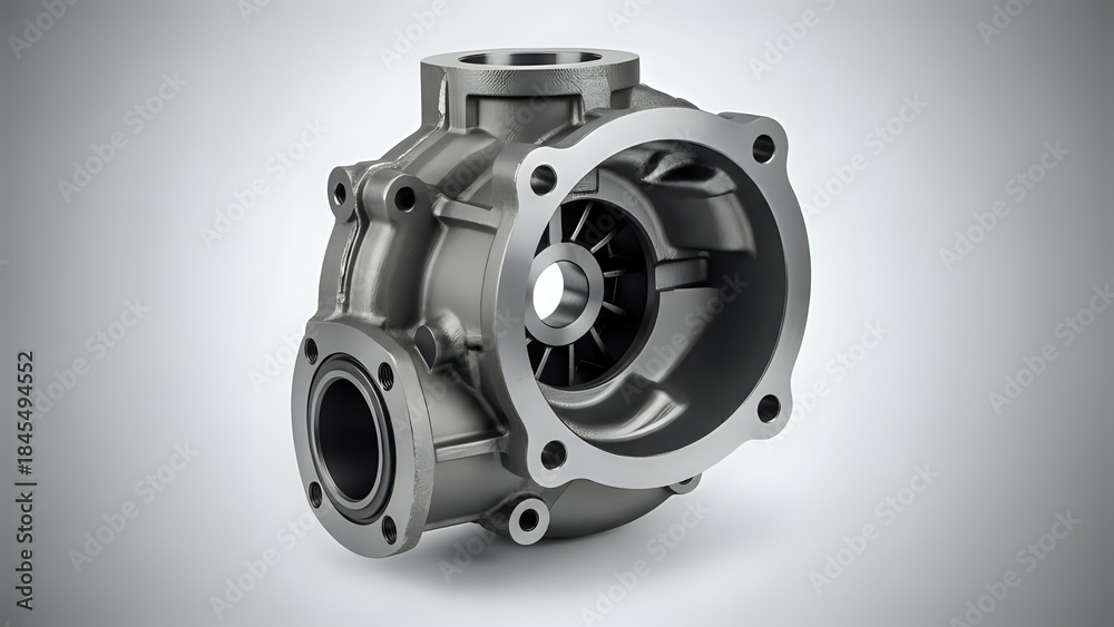 Detailed 3d rendering of a precision metal pump housing casting against a clean light #1845494552