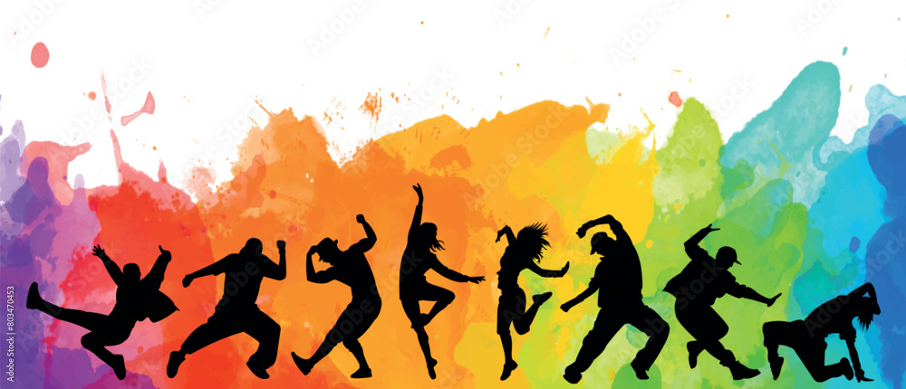 Detailed illustration silhouettes of expressive dance colorful group of people dancing. Jazz funk, hip-hop, house dance. Dancer man jumping on white background. Happy celebration #803470453