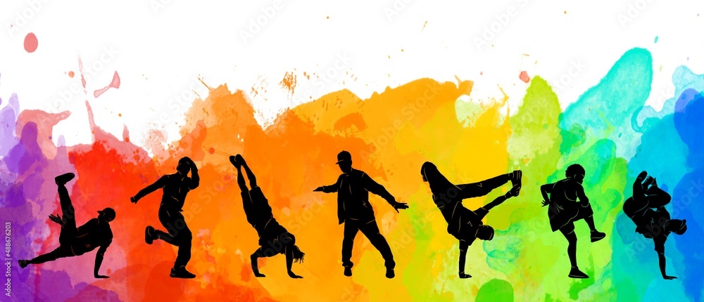 Detailed illustration silhouettes of expressive dance people dancing. Jazz, funk, hip-hop, house, breakdance dance watercolor. #488676203