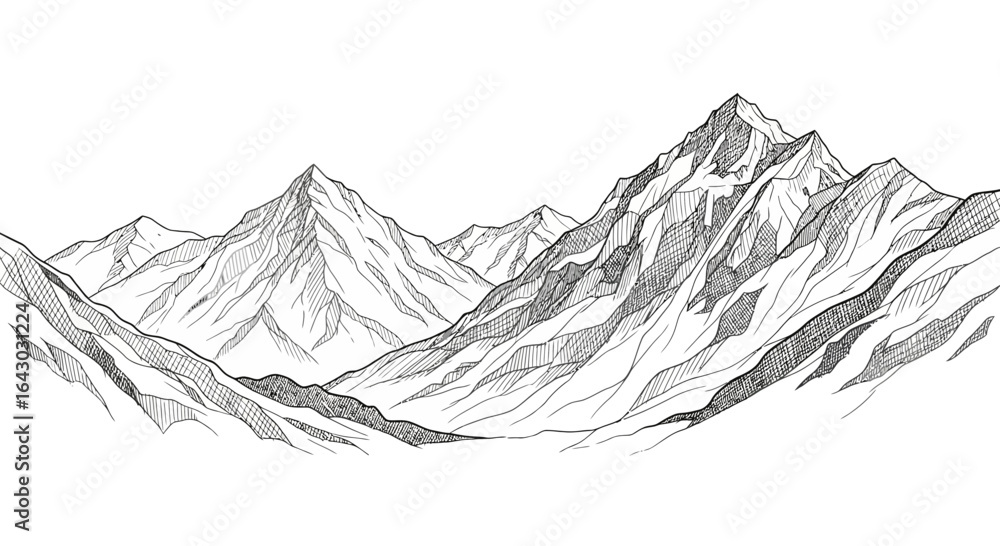 Detailed line art depiction of majestic mountain ranges landscape illustration #1643031224