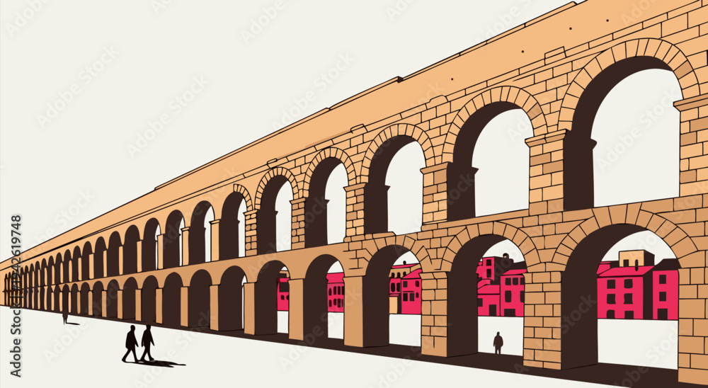 Detailed vector illustration of a long Roman aqueduct with arches, showcasing ancient architecture and urban development in historical perspective #1942619748