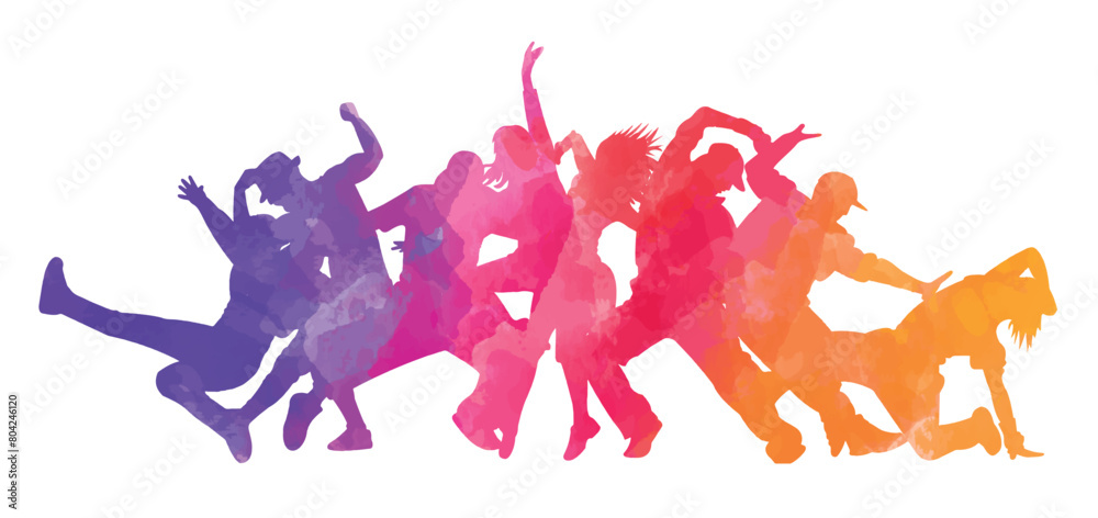 Detailed vector illustration silhouettes of expressive dance colorful group of people dancing. Jazz funk, hip-hop, house dance. Dancer man jumping on white background. Happy celebration #804246120