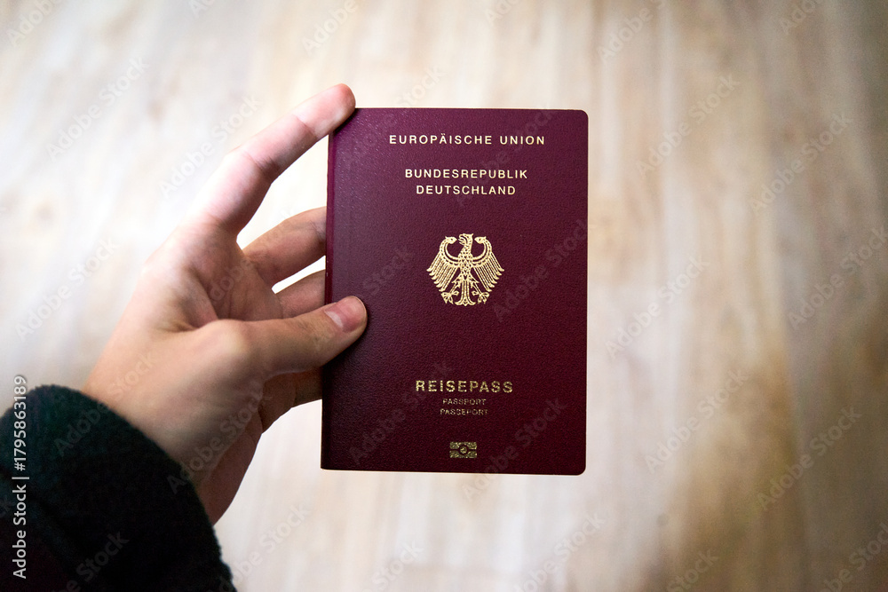 deutscher Reisepass in einer weiblichen Hand vor einem hellen Hintergrund. die aufnahme zeigt klare details des burgunderroten Passes und vermittelt ein gefühl von Reisen #1795863189