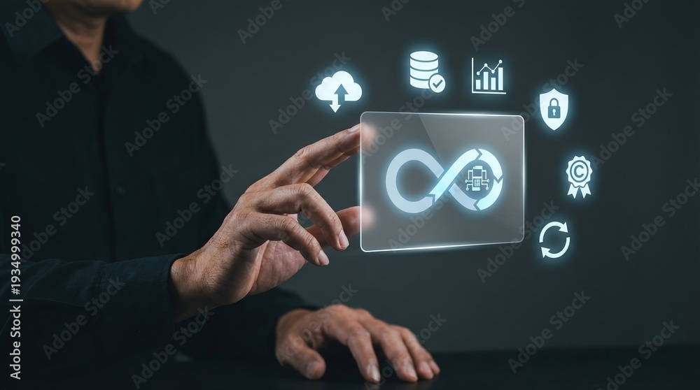 DevOps software development automation digital transformation cloud computing data management cybersecurity interface for business innovation and futuristic technology workflow. #1934999340