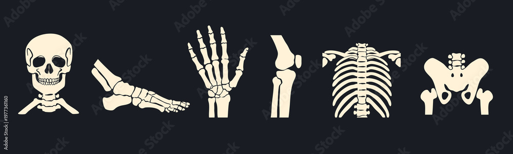 Different body parts. Human skeleton, foot, pelvis, arm, skull, chest, knee, ribs. Bone injury, medical scanning, checkup, hospital concept. Hand drawn Vector illustration #1977361160