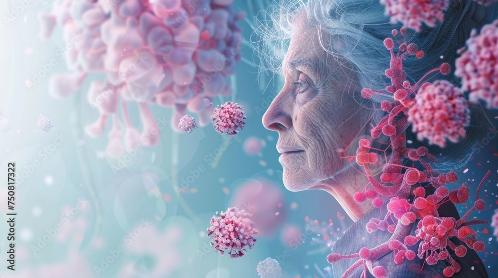 Digital art of an elderly woman with viral particles highlighting the concept of aging and susceptibility to infections #750817322