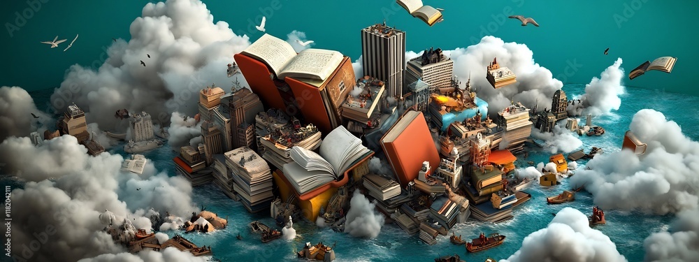 Digital artwork depicting a surreal tower of books representing the diverse genres of literature including fiction nonfiction poetry drama and more floating in a cloudy imaginative sky #1182042111