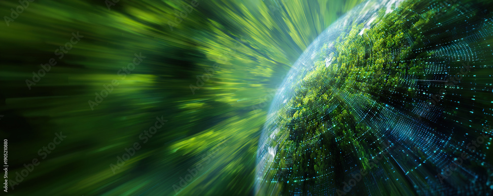 Digital background with green planet surface and flowing ecological data streams #1905210880