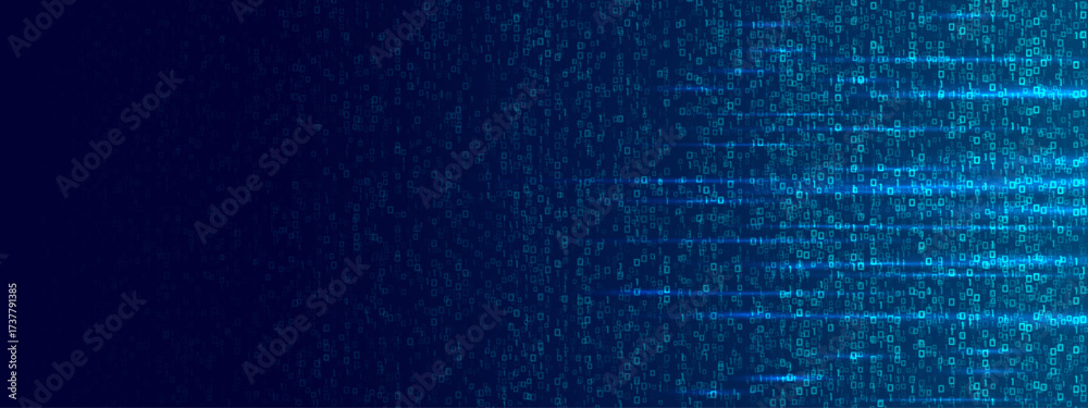 Digital binary rain effect in blue tones. Abstract matrix code flow with 0 and 1 digits, futuristic tech screen, cyber software, data stream, and computer security backdrop. Vector illustration. #1737791385