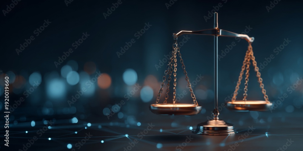 Digital scales of justice on futuristic background representing law, technology, fairness, and data analytics in a modern legal system environment. #1920019660