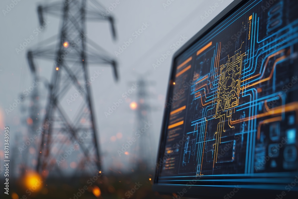 Digital screen displaying glowing circuit board diagrams against blurry industrial power pylons, concept for electrical grid maintenance, energy data analysis and infrastructure security #1871343905