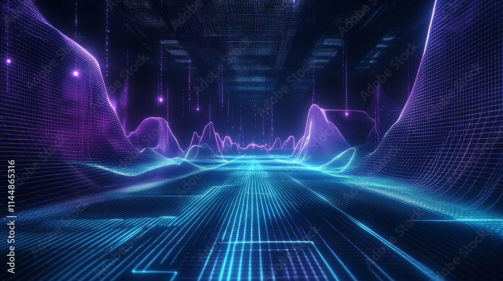 Digital technology abstract background with connected dots on 3d wave landscape. Concept of AI artificial intelligence, big data, data science, digital world, virtual reality, cyberspace, metaverse. #1144865316