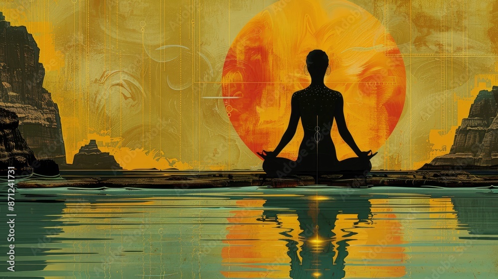 Digital yogi with energy flows, vector illustration with geometric shapes, urban twilight, clean lines, #871241731