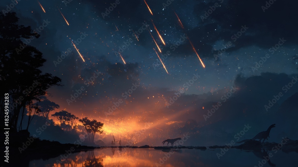 Dinosaurs Roaming Under a Meteor Shower Over a Prehistoric Landscape at Night #1824598283