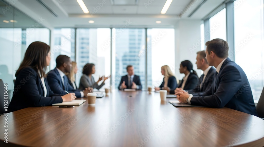 Diverse business professionals in formal attire are seated around a large, polished conference table during an important strategic meeting in a modern office. #1921013649