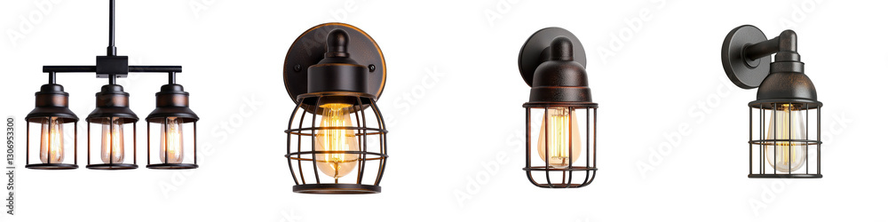 Diverse collection of vintage industrial modern and farmhouse inspired lighting fixtures including pendant lamps wall sconces and chandeliers for interior home decor and illumination #1306953300
