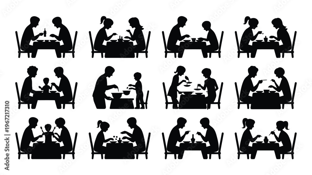 Diverse family and friends silhouettes enjoying meals together around dining tables representing connection community and shared dining experiences in various compositions #1967217310