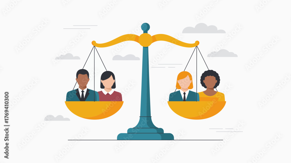 Diverse group of people representing equality and fairness on a balanced scale with clouds in the background #1769410300