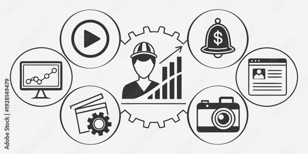 Diverse icons representing various aspects of business and technology Vector #1928149479