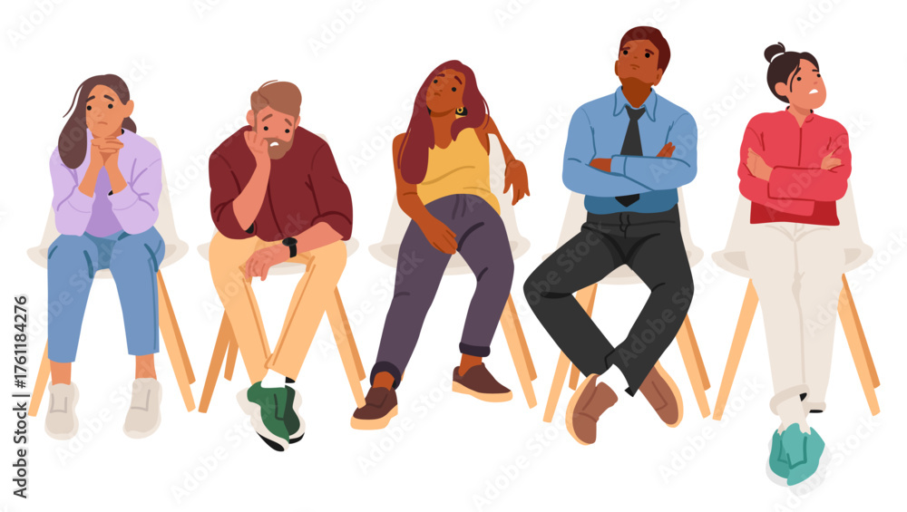 Diverse people cartoon characters feeling different emotions waiting in queue at hallway chairs #1761184276