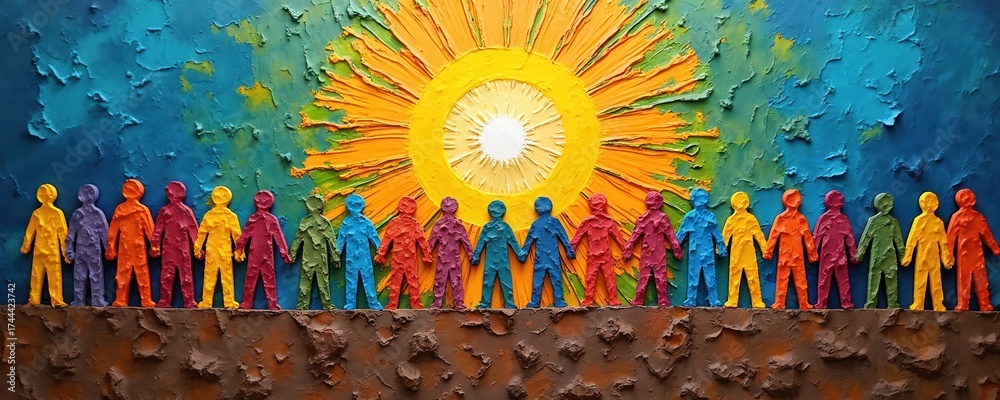 Diverse people hold hands united under bright sunburst. Colorful textured figures represent global community togetherness, hope, inclusion. Abstract art depicts humanity connection, shared future. #1744423742